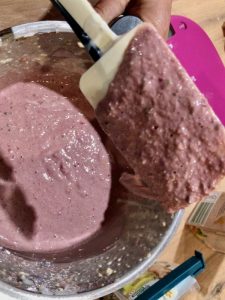 ♦️ Ajouter la compote, la fleur d’oranger et les fruits et mélanger à nouveau. Consistance finale comme une génoise.